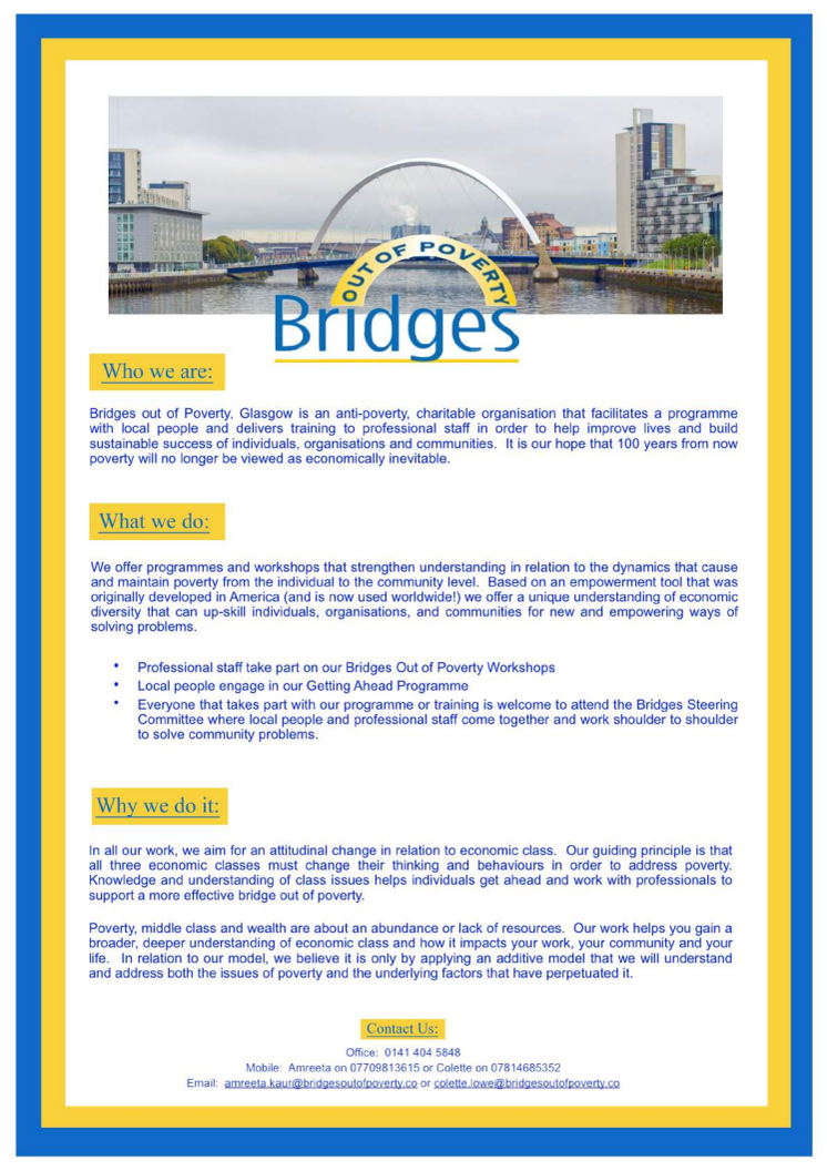 TENANTS of ng homes have recently completed the Getting Ahead programme with Scottish charity Bridges out of Poverty who help people in Glasgow move out of poverty and lead change in their communities.