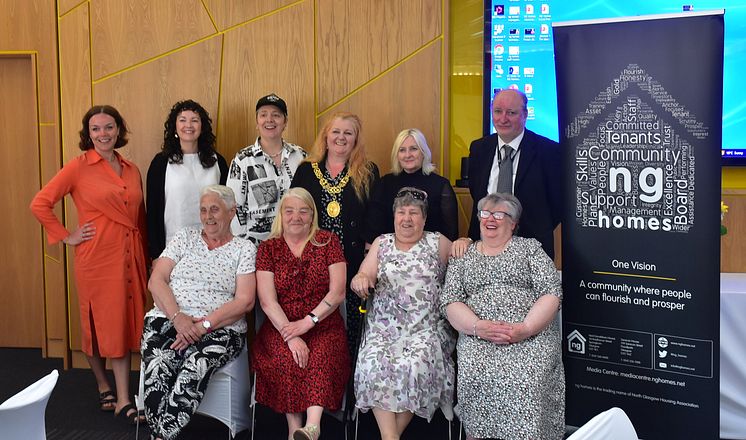 Celebrating in Saracen House Possilpark: (clockwise from left) Rachel Coburn (director/producer), Amy Rew (Glasgow Girls Club), Karen Dunbar, Glasgow Lord Provost Jacqueline McLaren, Margaret Fraser (ng homes Deputy Director of Regeneration), Bob Hartness (ng homes Deputy CEO), and stars of show, 'The Gallus'.