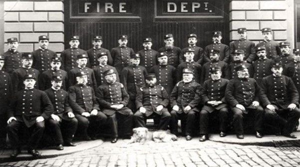 Wallace the Fire Dog in front of a Glasgow fire crew