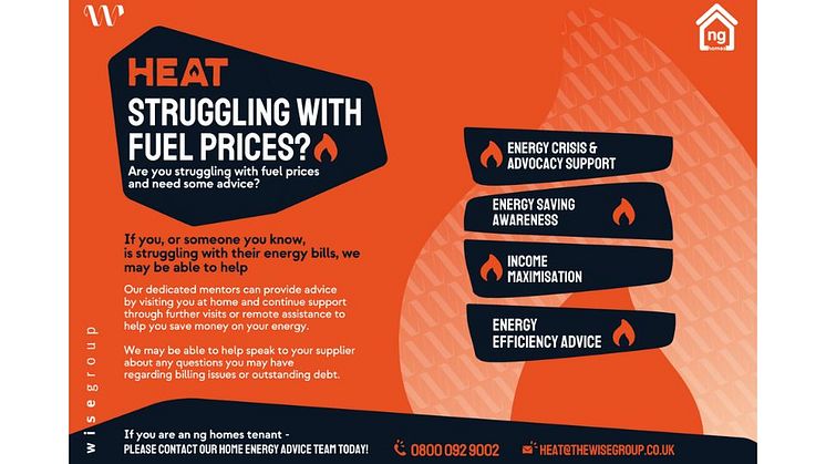 ng homes has partnered with The Wise Group to offer energy advice to tenants. The partnership offers ng homes tenants access to a wide range of services, including assistance with billing issues, applying for funding to help with energy debt, switching energy suppliers and more.