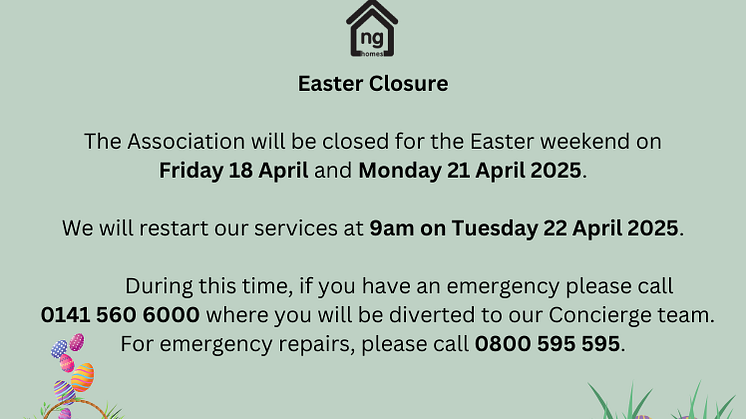 Our offices in Springburn (Ned Donaldson House) and Possilpark (Saracen House) will be closed Friday 18 April and Monday 21 April 2025. Our offices will re-open at 9am on Tuesday 22 April 2025.