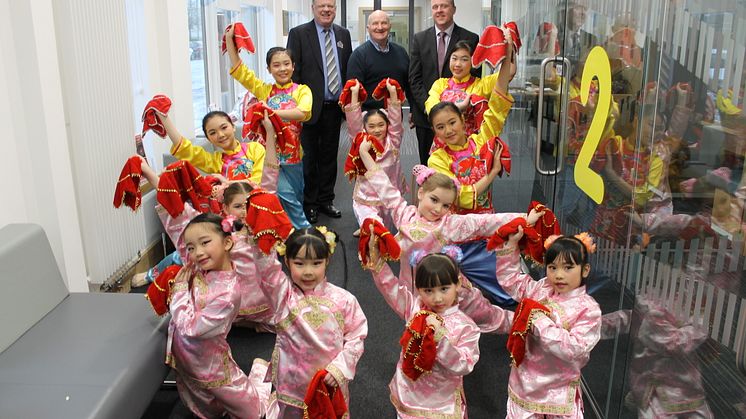 Local families Celebrate Chinese New Year in North Glasgow. ng homes Chairperson John Fury and CEO Robert Tamburrini are joined by Bob Doris MSP and dancers from Glasgow Oriental Dancing Association.